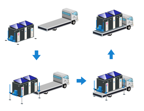 「アウトリガー」をオプション搭載することで、つり上げ用のクレーン車の手配が不要となります。特別な免許なしで4tトラックへの積込み、輸送、設置まで緊急を要する移設を可能とします。